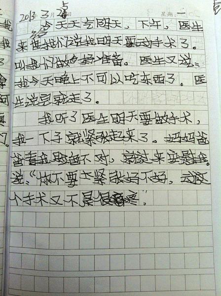 “3 月 25 日,今天天气阴天,下午,医生说明天我要动手术了,我一下子就紧张起来了。”