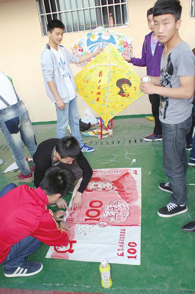 “草长鸢飞二月天,拂堤杨柳醉春烟,儿童放学归来早,忙趁东风放纸鸢。”4月3日上午8时,制作风筝活动拉开帷幕,高一高二各班学生组成的代表队投入紧张、兴奋的创意制作中。风筝的骨架是同学们用拆下的旧凉席里的竹片制成,风筝线是找来的用剩的毛线,纸是购买的宣纸。在比赛现场,袁粤和同学们根据自己的创意,利用这些原材料分工合作,扎骨架、糊宣纸、画风筝面……随着时间的推移,充满创意的风筝接连出生了——“校徽”、“为人民服务”、“百元大钞”……