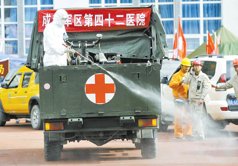 这几天,在宝兴县城经常可以看到一辆印有红十字的军绿卡车,它穿梭在各街区的每个角落喷洒消毒液,这是宝兴县唯一一辆防疫消洗车,来自成都军区第42医院。随着地震黄金72小时的结束,42医院的20多名官兵在宝兴县的任务也随之转换。该院院长唐伟革表示,截至昨日,防疫消洗车的喷洒面积已超10万平方米,这支“防疫奇兵”为百姓健康筑起了安全防线。