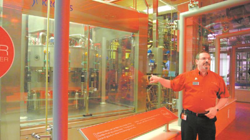 “慢速灌装,能让游客更加清楚地欣赏到是怎样变出美味可乐的。”罗伯特说,制造一瓶可乐需要这几个步骤:机械手臂将一箱箱空瓶放在流水线上—专用净水器去除水中杂质—净化后的水加入碳酸—与糖浆混合变身可乐—由机器灌装进瓶——加盖、打包、出厂!