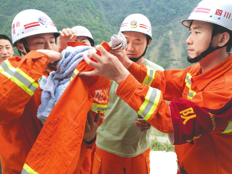 广安消防支队战士李成君立即接过孩子,抱在了自己怀里。“快给我,我送他下山,去县城医院让医生看看。”接过小坤宇,李成君就向山下走,并加快了步伐。指导员杜彭彭脱下自己的橙色工作服给孩子盖上,与李成君、小坤宇的父母一起护送他下山。