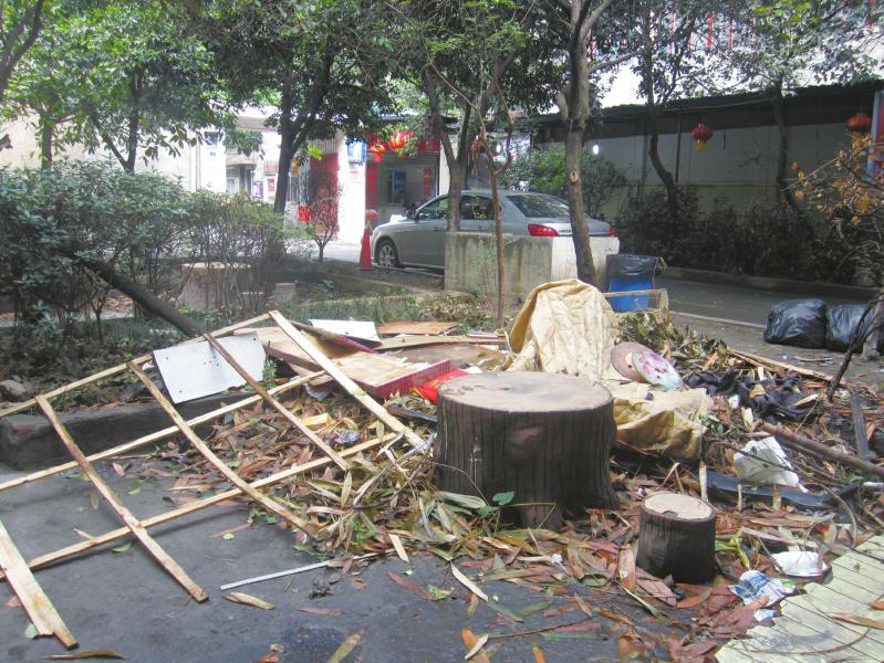 在居民们反映的花园旁,记者看到,未清运的垃圾已占据近十平方米的位置,主要是层板、木条和废旧椅子等大件垃圾,其中还夹杂着方便袋、一次性饭盒等垃圾。院门口开面馆的谭先生说,这堆垃圾已堆放近一个月,而且不时还有居民往这里扔垃圾。