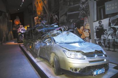 当一切归于沉寂,静态空间中“汉旺钟楼”的指针停止了跳动,倾斜倒塌的混凝土墙体与具有体量感的巨幅照片,将震后灾区断壁残垣、瓦砾遍地的景象,无声地展现在观众面前。一组组记录着地震波及范围、受灾面积和经济损失的数字,以及损毁的大量生产、生活用品和汽车残骸等实物,带给观众强烈的视觉冲击和震撼……