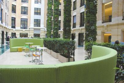 赛诺菲总部从外面看异常简洁,玻璃门,大理石外墙,除了门牌号和一个不大的logo外,没有其他任何标志物。赛诺菲的法文名“SANOFI”贴在大理石墙面上,每个字母仅有香烟盒大小。这个招牌,和排名第201位的财富500强企业似乎一点都不相称。大门是一扇很艺术感的玻璃门,黑色的门框上,有类似剪纸一般的镂空抽象花纹,两侧稍微小点的铁门关闭着,正好让人看见它所有的纹路。进门是一片绿色的墙,格子里布满了蕨类植物和苔藓,形成一片绿蔓。仔细一看,这些植物都是活的,苔藓上甚至还有水缓缓渗下来,滴到下方的小水池里。“这是我们的设计理念之一,开放。不仅员工的观念要开放,总部本身也要开放,内部环境和外部环境要融为一体。”玛瑞索·伯森说。其实,仔细一看,集团总部的装修主色,其实也是绿色。对于这个带给人健康、取材于生物的医药公司来说,象征生命的绿色,的确是最好的主题色。