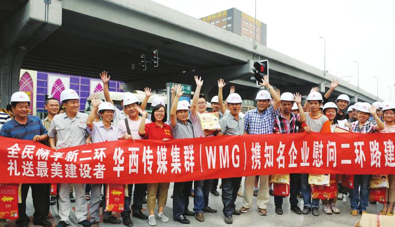 贯通全城的新二环通车了,那些奋斗在一线的建设者经过了400余个日日夜夜的奋战,终于将一份完美的答卷交给了市民。5月29日下午,成都市建委缓堵保畅办和WMG华西传媒集群,携手蓝剑饮品、金龙鱼大米、黄老五花生酥、蒙顶皇茶、蓝光美尚饮品等爱心企业,共同举办了主题为“礼送二环建设者”的温情慰问活动,囊括了饮水、茶叶、大米、休闲食品等慰问品的“华西大礼包”,为新二环的一线建设者送去了关爱。爱心礼包受欢迎