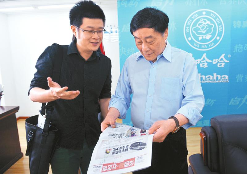 6月1日,四川省浙江商会办公室,中国首富、68岁的娃哈哈集团董事长兼总经理宗庆后,在接受本地媒体的采访时,听华西社区报记者阎越宽介绍《华西社区报》情况。