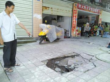 该坑洞位于广安区检察院旁边政通巷一侧的人行道上,大约长2米,宽1米,深半米左右。市民刘先生的门市正对着坑洞,在他印象中,坑洞是在4月下旬一个下雨天形成的。站在一旁的妻子补充说,前几天下暴雨,她还曾亲眼看到有白烟从洞中冒出,“当时还以为要爆炸了,担心得要死”。对此,刘先生猜测说,白烟可能是从洞旁边的化粪池冒出来的,因为附近没有天然气管道,而最近天气一热,坑洞也会传出一阵阵臭味。