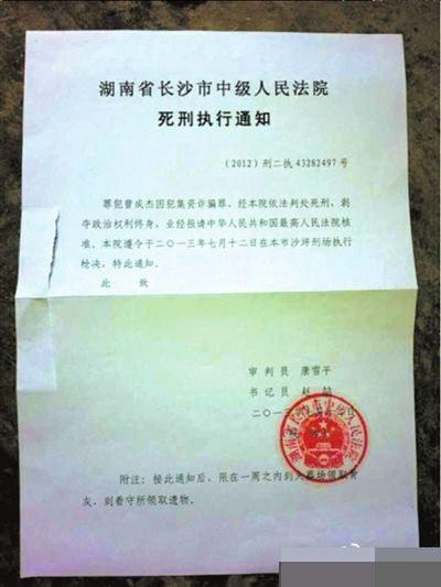 曾成杰的女儿曾珊表示,14日她收到了来自长沙中级人民法院的死刑执行通知的挂号信。这份标注日期为7月12日的通知内容为:罪犯曾成杰因犯集资诈骗罪,经本院依法判处死刑,剥夺政治权利终身,业经报请中华人民共和国最高人民法院核准。本院遵令于2013年7月12日在本市沙坪刑场执行枪决,特此通知。通知还附注:接此通知的一周内到火葬场领取骨灰,到看守所领取遗物。
