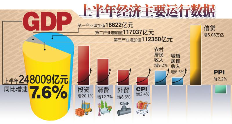 @华西都市报:上半年我国国内生产总值(GDP)达248009亿元,同比增长7.6%。其中,一季度增7.7%,二季度增7.5%。国家统计局新闻发言人盛来运指出,季度增速回落,是潜在生产率下降的客观反映,适当回落有利于调结构、转方式,经济运行态势仍然比较平稳。专家预计,中国经济今年仍将增长7.5%左右,“硬着陆”风险不大。