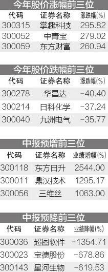 从披露的数据来看,中青宝、掌趣科技等199家上市公司预计2013年中期净利润出现同比上涨,占355家创业板公司的56.1%;而宝德股份、星河生物等156家上市公司业绩预忧,上半年可能出现下滑甚至亏损。