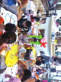 在“缤纷童趣艺术节”上,绘画老师在现场指导了数十名孩子用画笔和颜料在T恤上发挥想象进行创作。“把你心中最喜欢的东西画出来吧。”还未等老师话音落下,孩子们在调色盘里已经调好了颜色。有的画起了哆啦A梦,有的画起了蝴蝶和小鸟,还有的画起了汽车和火箭。
