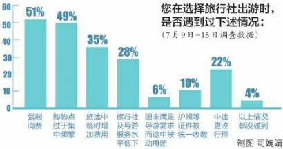 截至目前,经过一周时间,已有逾万名读者和网友积极参与,从目前的调查显示,有49%的游客在跟团游过程中遭遇过“强制购物”和“购物点过于频繁集中”的困扰;在面临旅游纠纷时,游客维权意识正在加强,有49%的游客会选择“旅游执法部门”进行维权;有48%的受访者认为目前旅游从业人员服务水平低下,而即将于10月1日开始实施的《旅游法》则让超过五成的游客认为这将有助于促进旅游市场法制化和规范化,杜绝旅游市场陋习。