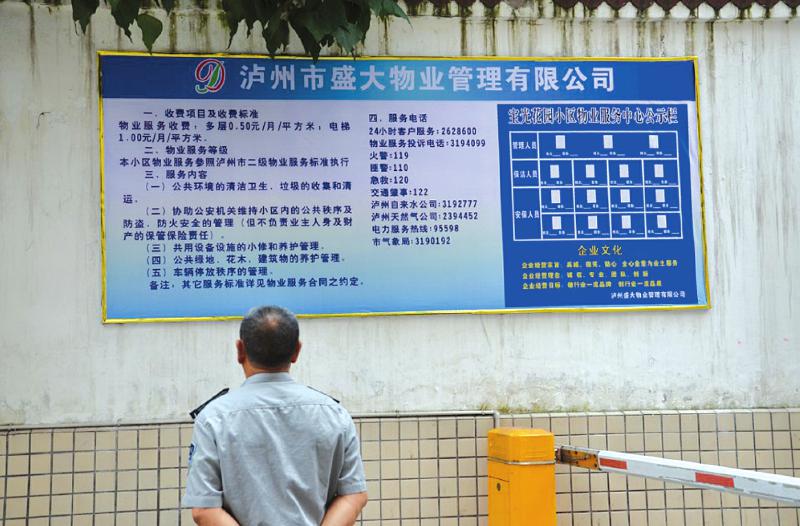 昨日,华西城市读本记者走进宝光滨江花园小区时,看到小区道闸旁有一块崭新的公告牌,公示了小区新选聘的盛大物业公司的收费项目、收费标准、物业服务等级、服务内容等。