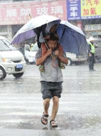2、《儿子,你和伞都到肩上来》:暴雨中,一位打着双伞托娃过街的男子。 拍客:taoy