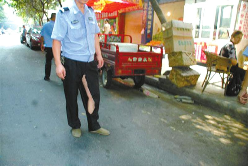 “我们把她的背篓收了,她就双手把我手抓住不让我走,我说‘大姐你要讲道理嘛’。”李勇说,该女商贩非但没有放手,反而一下子坐到地上,把他的腿抱住,开始抓他的裤子,腿在地上一边蹬,一边喊“城管打人”。在拉扯中,李勇的裤子被扯开半米多长的大口子。