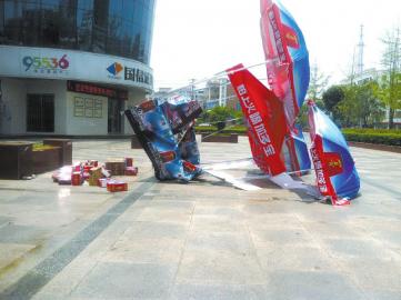 7月13日,在南充市嘉陵区好乐购超市门前,某凉茶品牌所摆设的四个促销点,遭到一群不明人士的打砸。接到报料后,记者在中午12点15分赶到现场看见货物散落一地,其中一个促销点的遮阳伞更是被掀翻。