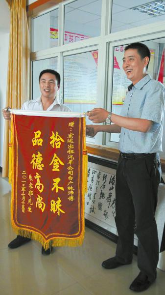 昨日下午,在广元市宏运出租车公司的办公室里,市民郭先生将一面锦旗送到出租车司机白广林的手上,连连道谢。