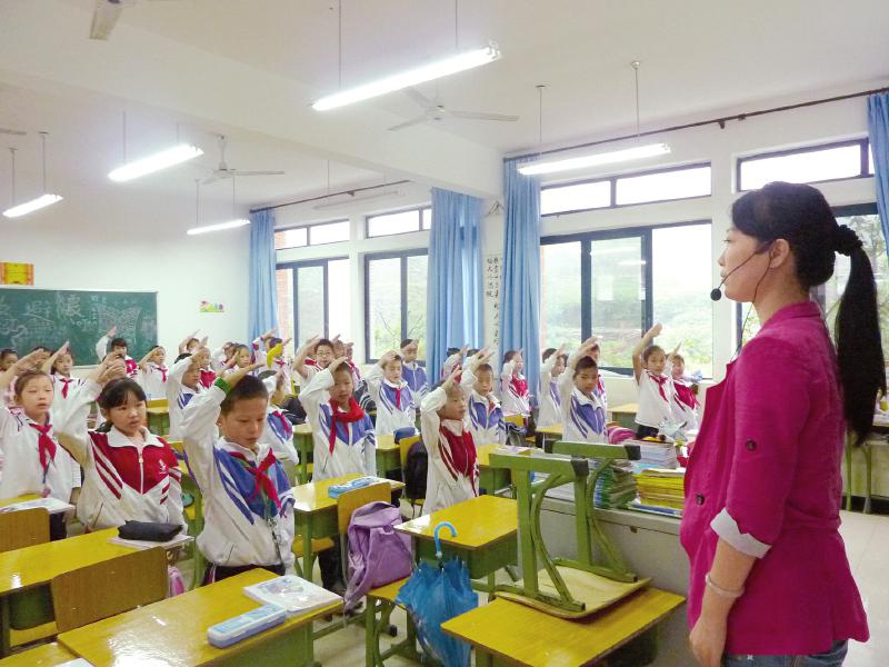 昨天开学适逢天气下雨,自贡汇东实验学校学生在教室里举行开学典礼。梁睿瑶 摄