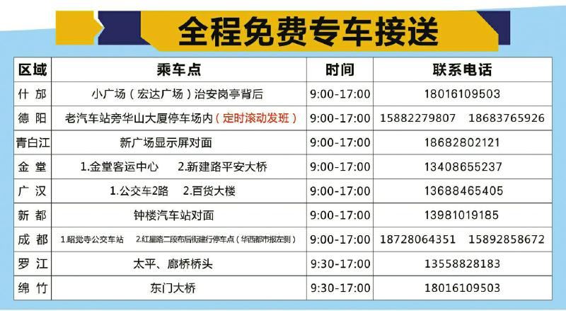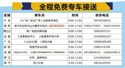 报名电话:028-96111,9月7日至15日,搞快去现场吧,50辆直通车免费接送。就在成都北的成绵高速广汉出口,你只需要25分钟车程。华西社区报记者刘晓蓉