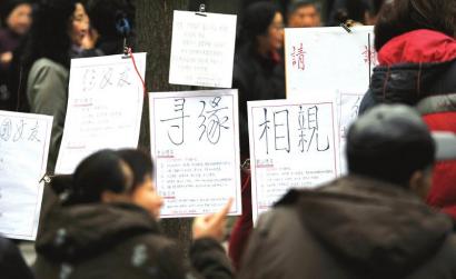 在成都人民公园、新华公园等地,相亲角是一个特殊的风景。一些父母在公园小道边立起一根竹竿,挂上一张相亲启事,通过互看照片、聊天,帮子女相亲。