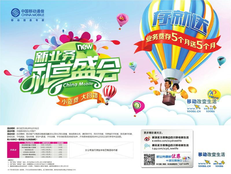活动内容:活动期间订购移动数据流量10元/20元/30元套餐、咪咕特级会员、通信助手包、四川手机报、华西手机报、新农通手机报、手机阅读、驾车助理、移动气象通、手机动漫、手机导航等活动指定业务,并承诺使用到2014年12月31日即可享受存送回馈。