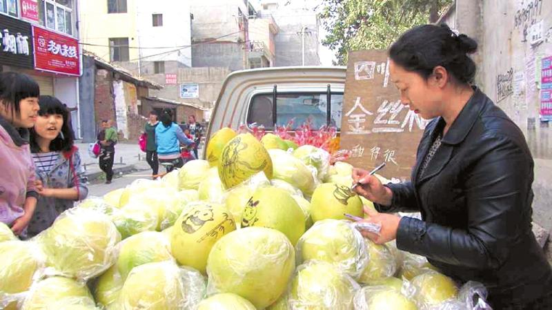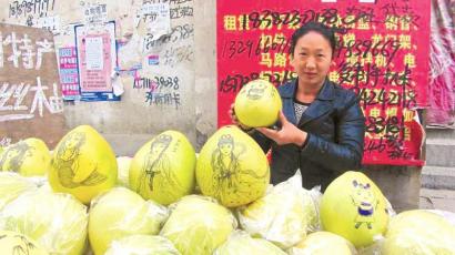 “啥子高手嘛,就读了个初中,又没有专门学过,只是他们觉得柚子上画画是个新鲜事而已。”邱荣芝说,自己从小喜欢画画,但没有专门学过。“一天只画得到十多二十个,她又不是专业的,还要称秤收钱,只是在空闲时间才画。”赖正波说,由于画了画的柚子还是卖3元钱一斤,很多人来了就专挑这些,很快就卖完了,“画不赢”。