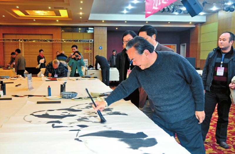 笔尖轻点,毛笔一挥,再蘸点浓墨,一会儿工夫,白净的宣纸上两只憨态可掬的熊猫栩栩如生,著名国画家戴卫笔下的熊猫图赢得各位书画家的声声赞叹。昨日下午,100余位来自四川各市州的书画院院长及最有代表性的书画家齐聚大千故里内江,挥毫泼墨,以笔会友,交流心得。由四川省委宣传部、省文化厅主办,省诗书画院和内江市人民政府承办的“2013年四川省画院中国年画双年展”在内江大千美术馆正式开幕,此次活动是内江市多年来举办的最大一次书画作品展览,将开展到12月8日,可免费参观。