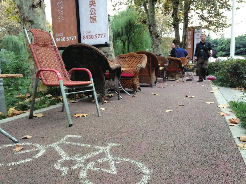 《华西社区报》,你们好:我是成都八里小区的居民,前两天我在踏水桥北街附近沿河街道骑自行车锻炼身体时发现,本来被划定出的自行车道已经被沿河茶馆占据经营,有的商家甚至占据了整条道路。我上前理论,但这些茶铺都是避而不谈。我觉得商家占用公共设施的经营行为,已经侵犯了我们居民的权益,希望贵报能够予以报道,促进这件事情的解决,感谢。 八里小区居民
