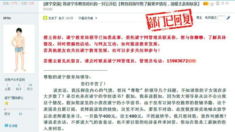 近日,有网友在遂宁本地论坛发表了一篇名为《致遂宁市教育局长的一封公开信》的帖子,该贴中,网友“UFOo”就在职教师校外有偿补课等问题对教育局长连续发问,该举动引来不少网友围观,甚至有网友称其为“遂宁最牛家长”。