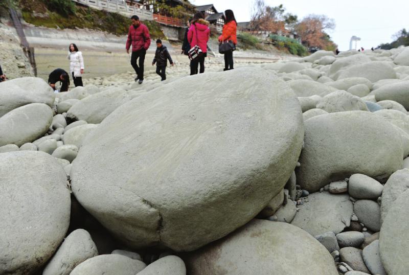 大修都江堰以来,12台抽水机24小时不间断将宝瓶口的水排往外江。昨日,宝瓶口的水深仅剩3米,水落石出,干涸的河床上露出了20余件宝贝。