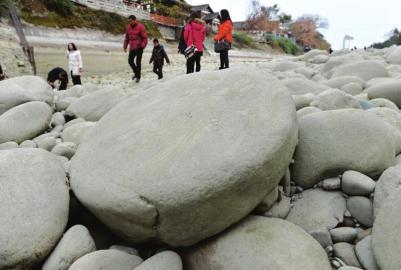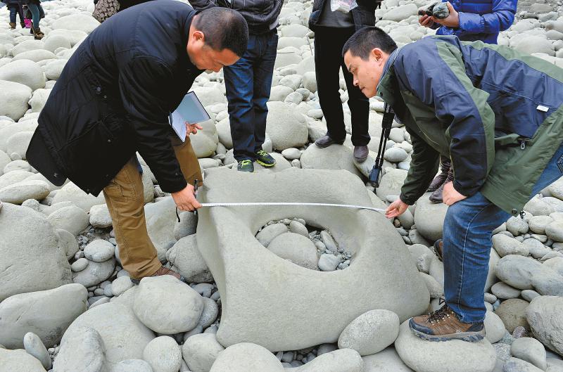 昨日下午,记者从南桥进入来到伏龙观下的河床。走了20余米,就见着6个圆圆、直径约95厘米,厚度约25厘米的石头分布在方圆不足1000平方米的河床里。不远处的河床里,还有十来块带有榫口的条石,其中一块上面还有一个深约10厘米圆溜溜的孔。“快来看。”正当记者专注于这些新奇的宝贝时,都江堰市文物局副局长傅浩又指着一个外方内圆的家伙对记者说,“这是石井圈,也是这次发现的宝贝之一。”