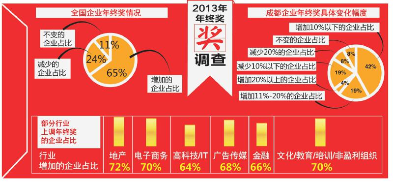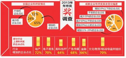 华西都市报:今年年终奖平均水平如何?近日,本报联合科锐国际人力资源公司发布的调查报告显示,2013年上调年终奖的企业将超过去年,有65%的企业表示将上调年终奖。不过,由于行业大环境影响,房产、金融等多个行业的人士表示,2013年年终奖将“滞涨”。而华西都市报发起的一项网友调查则显示,65%的网友预期今年的年终奖不会上调。