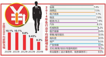华西都市报:根据对全国企业2014薪酬计划的调查,受中国经济增速放缓影响,全国企业2014年平均薪酬涨幅为8.3%,已连续5年下降。而成都受访企业水平略高于全国,预计2014年平均薪酬涨幅为9.83%。
