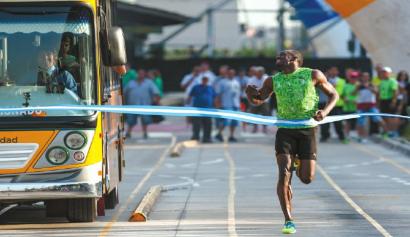 当天下午,布宜诺斯艾利斯气温一度高达35摄氏度,位于市中心的七九大道公交车道被临时改造成了短跑赛道,正在阿根廷访问的博尔特在这里与一辆59路快速公交车举行80米竞速。最终博尔特轻松获得了胜利,并在终点摆出了他庆祝胜利的招牌动作。博尔特在赛后表示,自己正在尝试继续提高自己的百米成绩,并将目标锁定到了2016年的巴西里约热内卢奥运会的百米冠军。据新华社