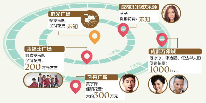 各路明星纷纷来成都进行跨年大促销,成都各家Shopping Mall的花费不菲。据广州一家公关公司的相关负责人说,明星的档期年底非常紧,价格比平时贵很多,一般来说商场的跨年活动的价格要翻倍,而且不一定约得到明星。