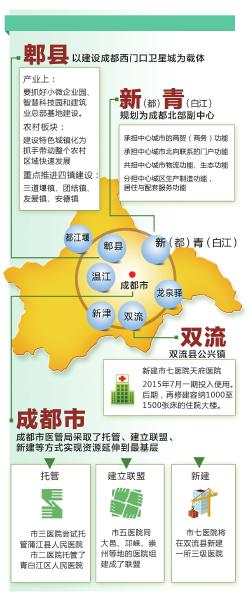 成都市第五人民医院推出医院联合体,把大邑、邛崃、崇州等地的医院组建成了联盟,在联盟内实现资源共享,联盟内的急、重病人进该医院走绿色通道,优质的设备各家医院实现共享,并派专家前去巡诊查房等。目前,这个联合体已有20多家乡镇卫生院和社区卫生中心。还有一种方式就是新建。比如说,成都市第七人民医院在双流县公兴镇新建一所三级医院。