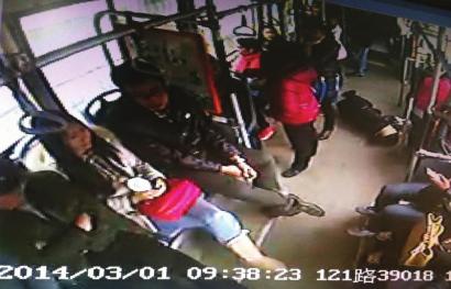 车厢内一阵骚动,坐在车后门前方座位的红衣女子立即起身让座,此时,黑衣女子已将女孩从地上扶起,和红衣女子一起将她扶到座位上。