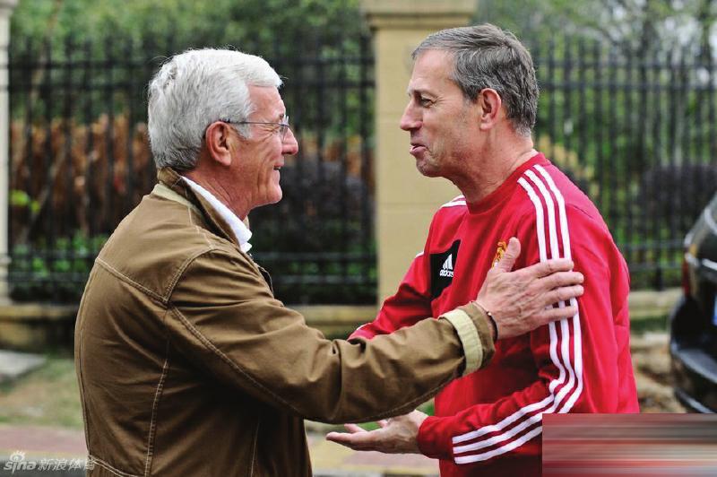 佩兰刚上任,国足“绯闻”主帅里皮就来了。按计划,国足昨日午饭时间是12时,恒大预备队的午饭时间是12时30分。中午1点钟左右,恒大主帅里皮现身清远恒大酒店球队餐厅门口,此时,里皮和阿兰·佩兰有了第一次握手和交流(上图)。