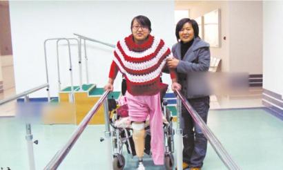 失去双腿的魏玲用一年时间丢掉拐杖和轮椅,练习用假肢走路。