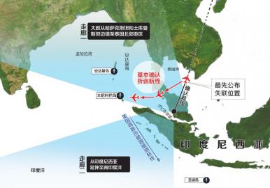 飞机最后与卫星失联的地点有两个可能区域:一是大致从哈萨克斯坦和土库曼斯坦边境到泰国北部,二是从印度尼西亚延伸到南印度洋。