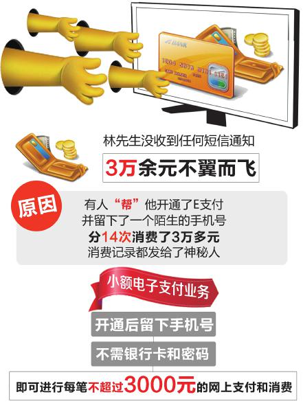 昨日,市民林先生致电本报,他偶然发现,卡里的3万余元在半个月内,以每笔不超过3000元的方式分14次盗刷走,尽管他开通过账户金额变动的短信提示,却一次都没收到过提醒短信。警方提醒:小额电子支付存隐患,银行卡开通应谨慎。