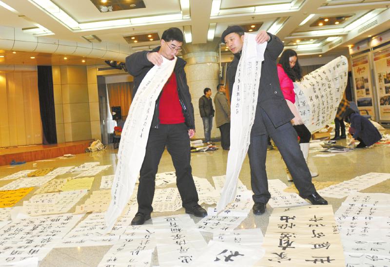 3月2日,记者在四川日报二楼多功能大厅的评审现场看到,绘画和书法类参赛作品,被工作人员分批密密麻麻地摆在地上,7位专家评委分成两拨分头评审。根据评审规则,评委们先分别评出绘画、书法类入选作品,再评定特、一、二、三等奖,余下的为优秀奖,书法和绘画类的特等奖最后需经7位评委共同审定。绘画评审由评委会主任刘正兴带领著名画家米金铭、巫成金、刘光灿负责,书法评审由省书协常务副主席兼秘书长戴跃带着著名书法家洪厚甜、钟显金负责。