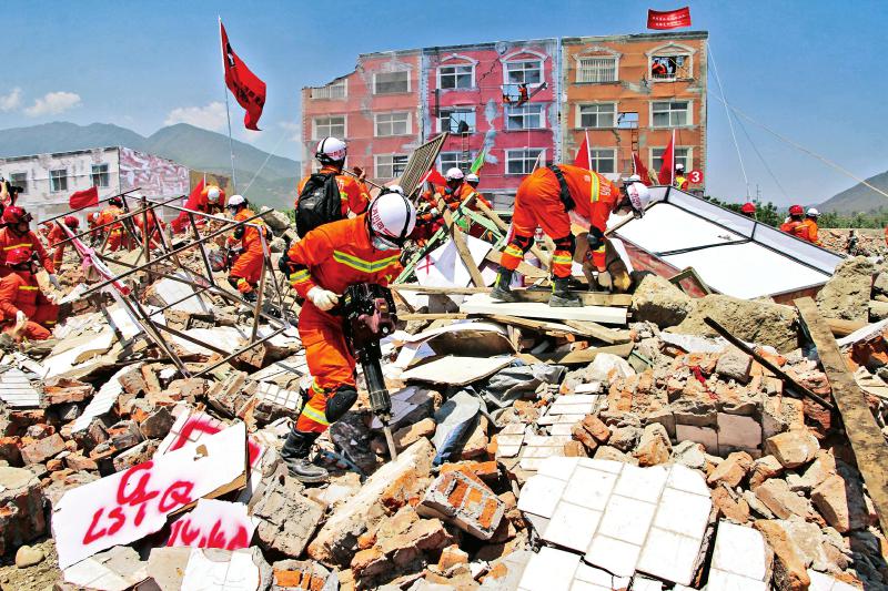 4月19日,在凉山彝族自治州冕宁县城厢镇长征社区,消防战士进行废墟救人演练。