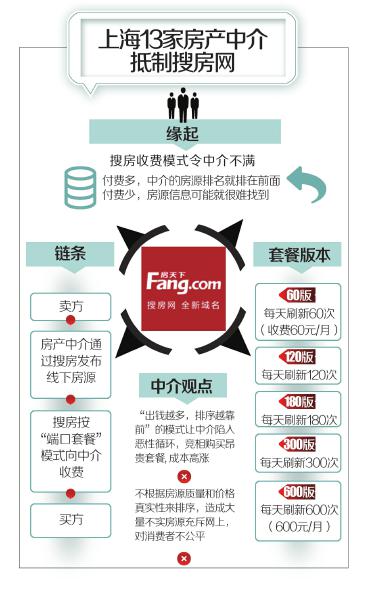 上海中原地产东区中介部总经理李锦德透露,搜房网的套餐版本最早只有60版本和120版本,后来其又以更高的价格推出了刷新频率更高的版本。搜房网的收费模式让所有的中介陷入了一个恶性循环——“出钱越多,排序越靠前”。这种不根据房源质量和房源价格真实性来排序的模式不科学。