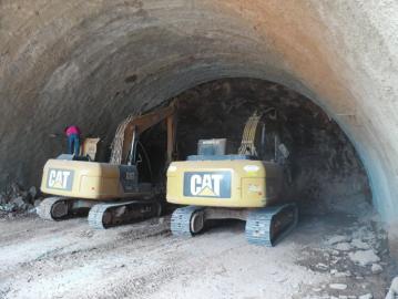昨日中午两点,泸州气温高达36℃,在靠近沱二桥南的忠山隧道项目施工地上,几台重型卡车和铲土机在场内休息,隧道洞口处传出“嗒嗒嗒”的机器作业声。在隧道的一个洞口里,两台碎石车正不停地在洞内进行开凿,溅起的尘土飞扬到洞口外形成一层“白烟”,而另一个洞口目前还处于“待开发”状态。靠近在洞口外高约20米的边坡上,一些钢架贴着山体竖立。