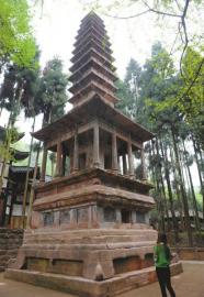 寺中现存的一通清咸丰三年(1853年)《重刊古志》碑,记载了塔的来历。胡立嘉解读说,宋之乾道四年戊子(1168年),一个名叫“安静”的僧人云游至此,观察到山中有地火涌动,他觉得这是有妖气作祟,便两次申奏朝廷,想在这里建立寺庙和修筑佛塔。最后得到了皇帝御批:朕闻佛塔佛教助国化乡,准奏。
