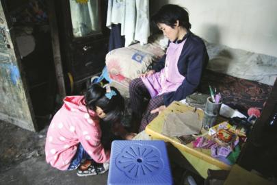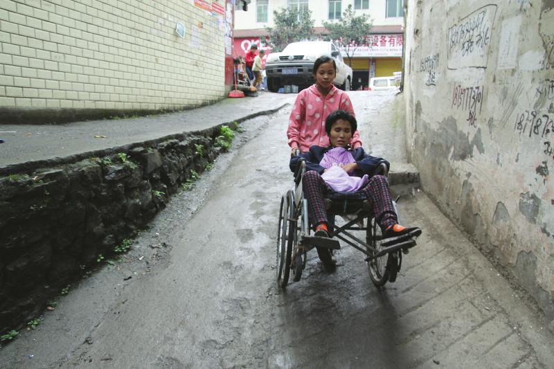 这位小女孩今年13岁,名叫李立英,轮椅上坐的,是她患有腿疾的妈妈。