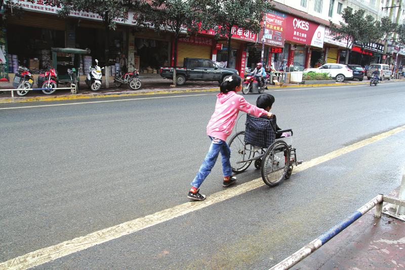 果你每天都走在兴文的街头,也许你会注意到一个小女孩,她每天都会推着轮椅带着一位中年妇女出来散步。小女孩一边走,一边逛,遇到上坡的地方,她向前倾斜着单薄的身体,两只脚使劲儿往后蹬,用力推着轮椅缓慢前行;遇到上台阶的时候,她则用力将轮椅前方翘起来搭在台阶上,然后放低身体,双手抬住扶手,借助肩膀的力量,一咬牙,轮椅便稳稳地上了台阶……小女孩看起来很单薄,但她小小的身体却似乎有一股强大的力量,始终牢牢掌控住轮椅。
