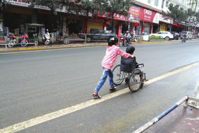 记者:你推着妈妈到街上散步,会不会害怕别人用异样的眼光看着你?