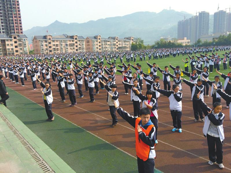 “你是我的小呀小苹果,怎么爱你都不嫌多……”昨日,达州市第一中学组织了“百名网友进一中”活动,来自达州本土的百余名网友齐齐走进达一中校园参观交流。在体育大课间活动中,学生们颠覆了以往的广播体操,转而跳起了火爆网络的《小苹果》。